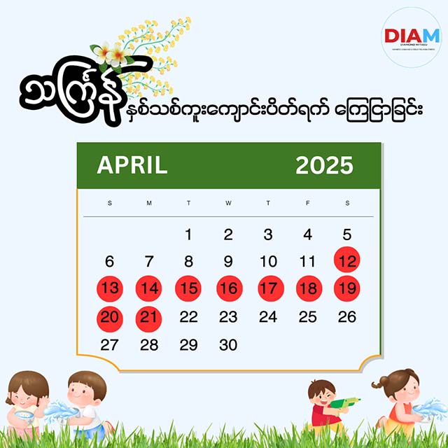 As the vibrant Thingyan Festival approaches, we would like to inform our students and community members about our upcoming school holiday schedule. DIAM Japanese Language School and Training Center will be closed from April 12th to April 21st in observance of the Thingyan New Year celebrations. During this period, all class sessions and office operations will be temporarily suspended. We will resume regular classes and office activities on April 22nd. We kindly ask for your understanding and wish you and your families a joyful, safe, and refreshing Thingyan holiday. Happy New Year from all of us at DIAM!